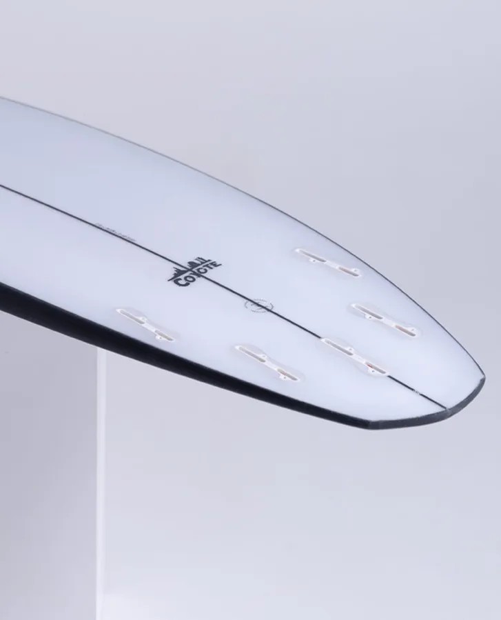 The rounded diamond tail works to reduce width behind the back foot in turn creating a board that feels comfortable when turning tight in the pocket. This design was refined on the fun walls of Broken Head & Winki Pop over a four year period which has seen it transform into a user friendly design that performs for all levels of surfer. The relaxed rocker is blended with a shorter more parallel outline that enables very fast acceleration on takeoff which is assisted by a single concave under the front foot. The double concave between the fins and vee off the tail ensures rail to rail transitions are easy during high speed carving turns. Produced with traditional materials the Coyote has a PU core with 2 x layers of 4oz E-Cloth on the deck and 1 x layer of 4 oz E-Cloth on the bottom ensuring a durable functional surfboard that will perform for wide range of surfers in a diverse range of conditions. *Pool recommended* The Coyote is the perfect board for the pool, this board is made to be surf 3-4 inches shorter than your regular shortboard which fits into the curve of the pool a lot better, the rounded diamond holds it speed in the curve of the wave while the relaxed rocker maintains speed through turns. If your booked in for Beast Mode chuck the Quad fins in and take off late with less board and feel the drive through the barrel with single concave under the front foot.